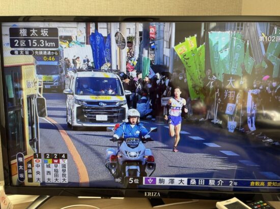明美先生が審判(走路員)を務めていることもあり、往路は朝からテレビ中継に釘付けでした。